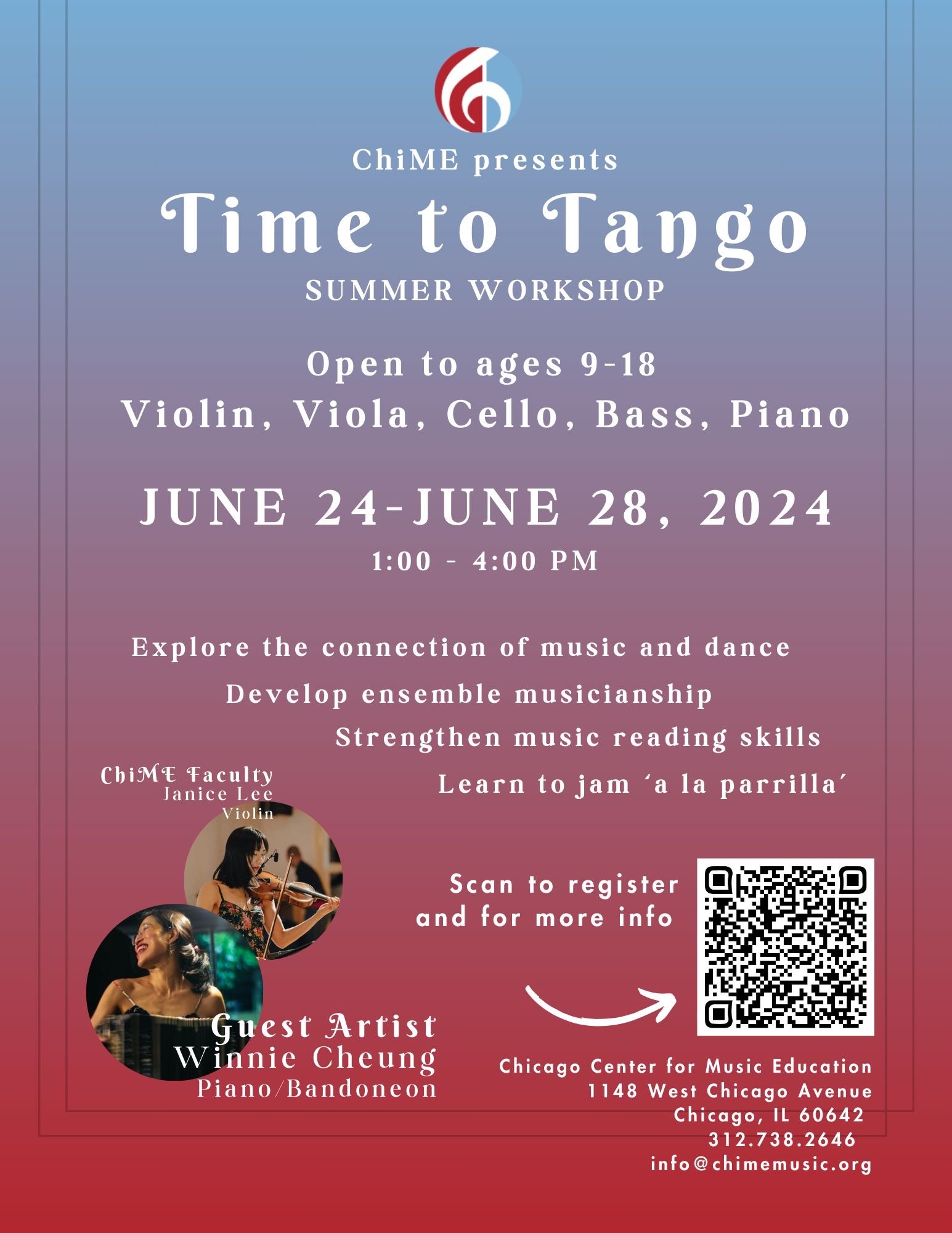 Join us for this week-long summer camp to explore the connection of music and dance, develop musicianship, strengthen reading skills, learn to jam “a la parilla,” and discover this beautiful style of music through your own instrument. The camp is open to students 9-18 years old who play the violin, viola, cello, bass, and piano. The camp will be led by ChiME faculty with the help of Winnie Cheung from “Tango with Winnie.”